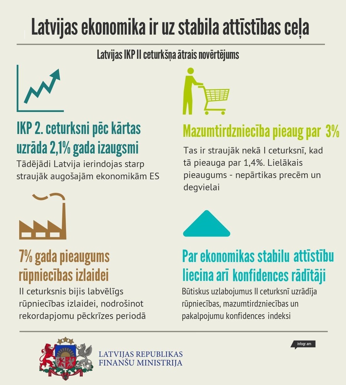 Otrais ceturksnis bija ļoti labvēlīgs rūpniecības izlaidei, kas uzrādīja 7% gada pieaugumu, tādējādi nodrošinot rūpniecības izlaides rekordapjomu pēckrīzes periodā. Lielāko pozitīvo ietekmi uz rūpniecības izlaidi radīja izaugsme apstrādes rūpniecībā. Turklāt, rūpniecības straujāka attīstība notiek nozarēs, kas ir orientētas uz eksportu. Līdz ar to sagaidāms, ka arī preču eksporta dati varētu būt daudz labāki nekā pirmajā ceturksnī. Pēc FM aplēsēm preču eksporta reālais gada pieaugums otrajā ceturksnī varētu būt pat 3 %, pretstatā attiecīgi 3,8% kritumam pirmajā ceturksnī. Eksporta relatīvi labo sniegumu nosaka arī Krievijas noteikto sankciju ietekmes izzušana uz statistikas datiem, tādējādi eksporta kritumu uz Krieviju nosaka tikai tās zemā pirktspēja.