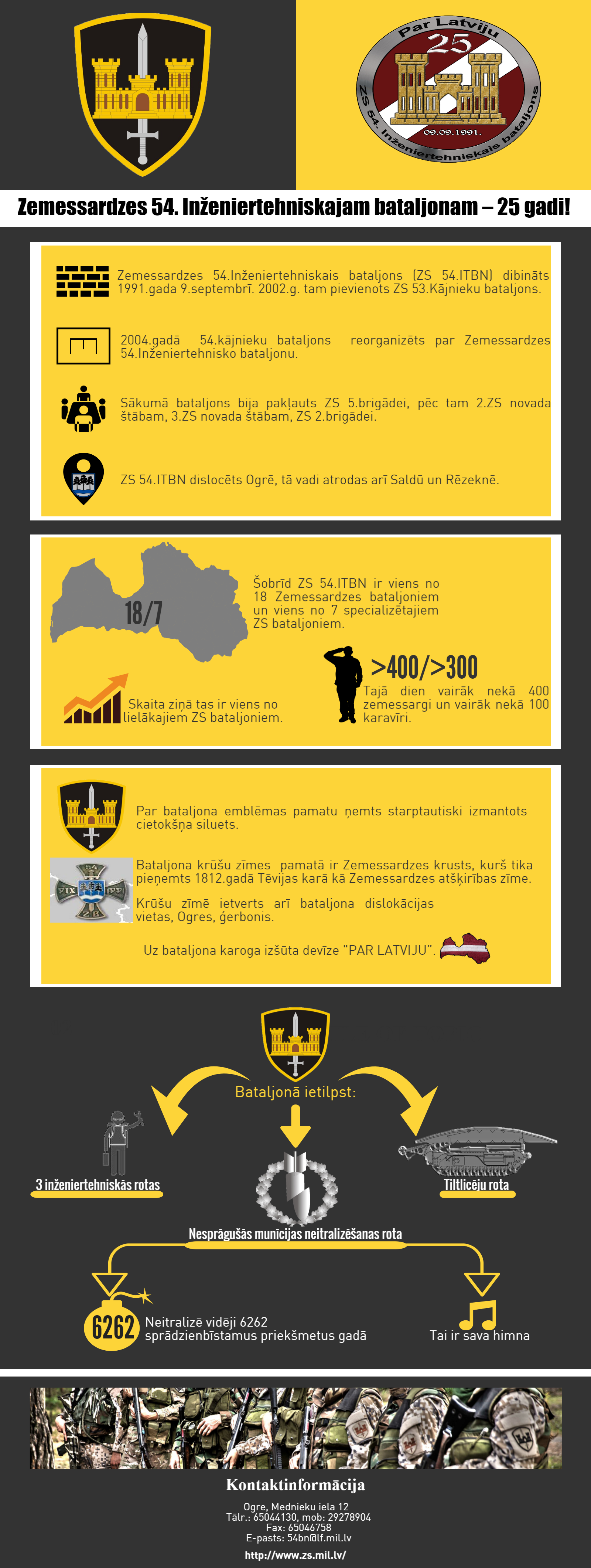 Zemessardzes 54.bataljons dibināts 1991.gada 9.septembrī un 2002.gadā tam tika pievienots Zemessardzes 53.kājnieku bataljons, tā personālsastāvs un atbildības teritorija. 2004.gadā 54.kājnieku bataljonam pievienoja Nesprāgušas munīcijas neitralizēšanas rotu un bataljons tika reorganizēts par Zemessardzes 54.Inženiertehnisko bataljonu. Dienesta pienākumus Zemessardzes 54.Inženiertehniskajā bataljonā pilda vairāk nekā 400 zemessargu un vairāk nekā 100 profesionālā dienesta karavīru. Bataljona sastāvā ir trīs Inženiertehniskās rotas, Tiltlicēju rota un Nesprāgušās munīcijas neitralizēšanas rota ar apakšvienībām Saldū, Ogrē un Rēzeknē, kas neitralizē nesprāgušo munīciju visā Latvijas teritorijā.