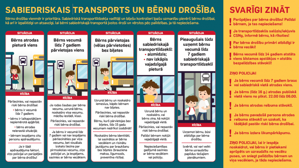Informatīvajā materiālā koncentrētā veidā ir apskatītas tipiskākās ar bērna drošības apdraudējumu saistītās situācijas un iespējamā transportlīdzekļa vadītāja vai biļešu kontroliera rīcība, lai novērstu bērna drošības apdraudējumu.