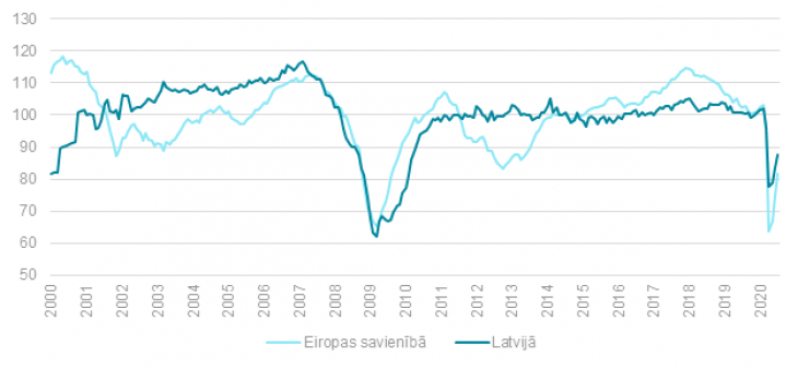 2020. gada jūlijā ekonomikas sentimenta rādītājs bija 87,63, kas ir par 3,9 punktiem vairāk nekā jūnijā. Ekonomikas sentimenta rādītājs raksturo kopējo sociāli ekonomisko situāciju valstī noteiktā periodā (mēnesī), un to visām ES valstīm pēc vienotas metodoloģijas aprēķina Eiropas Komisijas Ekonomikas un finanšu lietu ģenerāldirektorāts, par pamatu ņemot 15 dažādas sezonāli izlīdzinātas rūpniecības, būvniecības, mazumtirdzniecības un pakalpojumu nozaru, kā arī patērētāju konfidences rādītājā ietvertās komponentes.