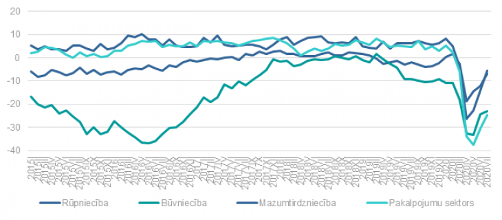 Pakalpojumu sektorā 2020. gada jūlijā pēc sezonāli izlīdzinātajiem datiem konfidence bija -24,6. Salīdzinot ar jūniju, šis rādītājs pieaudzis par 5,8 procentpunktiem. Konfidences rādītāji jūlijā vēl joprojām ir negatīvi gandrīz visās pakalpojumu nozarēs, pozitīvas vērtības sasniedzot tikai ēku uzturēšanas un ainavu arhitektūras pakalpojumos, datorprogrammēšanā, kā arī veterinārajos pakalpojumos. Viszemākie rādītāji tāpat kā iepriekšējā mēnesī bija gaisa transporta, izmitināšanas, ēdināšanas, kā arī ceļojumu biroju un tūrisma operatoru nozarēs.