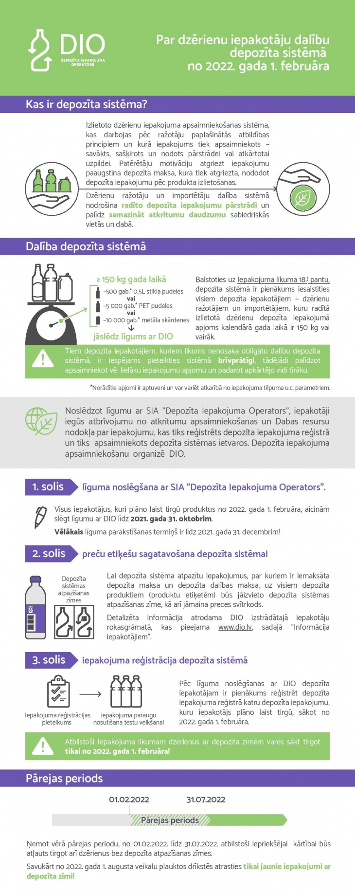 Šobrīd noris aktīvs darbs pie depozīta sistēmas dzēriena iepakojumam ieviešanas, lai tā uzsāktu darboties 2022. gada 1. februārī. Dalība depozīta sistēmā ir obligāta visiem depozīta iepakotājiem – dzērienu ražotājiem un importētājiem, kuru radītā izlietotā dzērienu depozīta iepakojuma apjoms kalendārā gada laikā ir 150 kg vai vairāk, t.i., aptuveni 500 vienības 0,5L stikla pudeļu vai 5 000 PET pudeļu, vai 10 000 vienības metāla skārdeņu.