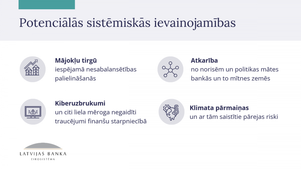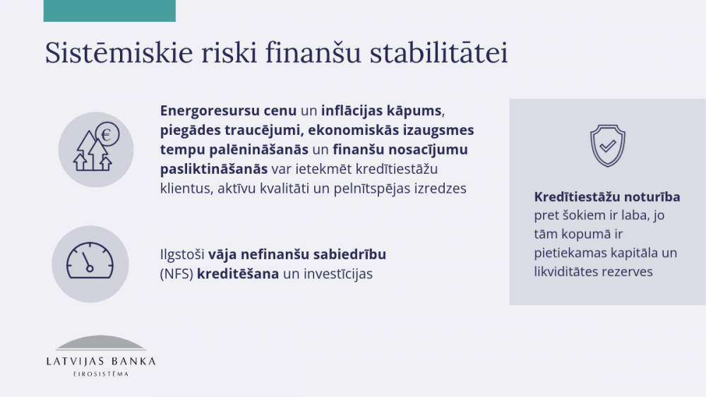 - Tautsaimniecību un finanšu sektoru skar pārbaudījumi saistībā ar Krievijas iebrukumu Ukrainā, energoresursu un izejvielu cenu kāpumu un piegādes ķēžu grūtībām. Kredītiestāžu kredītrisks un pelnītspējas risks ir pieauguši.