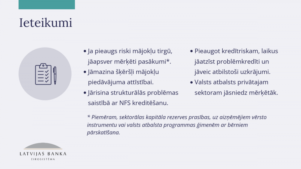 Ja mājsaimniecību kreditēšana sāks kļūt pārāk strauja, apsverami mērķēti pasākumi potenciālās nelīdzsvarotības mazināšanai (piemēram, sektorālas kapitāla rezerves prasības, uz aizņēmējiem vērsto instrumentu pārskatīšana, valsts atbalsta programmas ģimenēm ar bērniem pilnveidošana). Lai mazinātu pieprasījuma un piedāvājuma nelīdzsvarotību nekustamā īpašuma tirgū, svarīgi mazināt šķēršļus mājokļu piedāvājuma attīstībai.