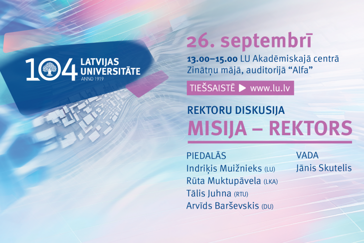 Diskusija “Misija – rektors” ir viens no LU 104. jubilejas nedēļas pasākumiem. Pasākumu rīko LU Studiju attīstības un pārvaldības pilnveides programma.