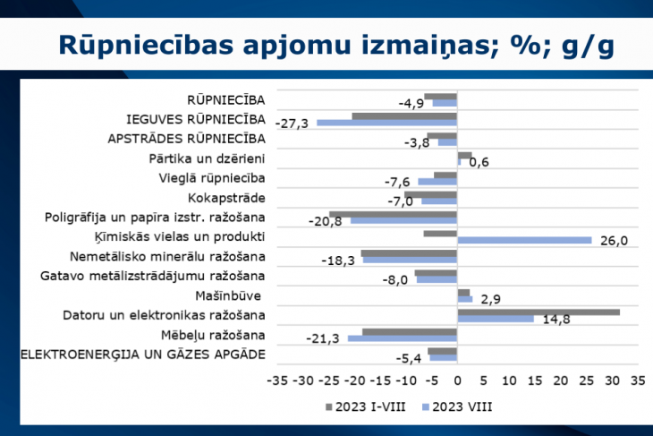 Šā gada augustā lielākā apstrādes rūpniecības apakšnozare – kokrūpniecība – sarukusi par 7% pret pērnā gada attiecīgo periodu. Centrālo banku procentu likmes joprojām ir augstas, tādēļ būvniecības un nekustamā īpašuma sektors Latvijas eksporta partnervalstīs vēl neatkopjas, kas savukārt neļaus pieaugt pieprasījumam pēc Latvijā ražotiem kokmateriāliem un citām precēm. Arī būvmateriālu ražošana augustā sarukusi par 18,3%, bet metālizstrādājumu ražošana samazinājusies par 8%. Turpretī pārtikas nozarē ražošanas apjomi bija samazinājušies ik gadu no 2018. – 2022. gadam, taču šā gada astoņos mēnešos apjomi auguši par 3,3%, un šā gada augustā par 2,6%, bet dzērienu ražošana augustā samazinājusies par 17,1%, kopā veidojot zemāk grafikā redzamo 0,6% pieaugumu. Jau divpadsmito mēnesi pēc kārtas pieaug datoru un elektronikas ražošana, augustā pieaugumam esot 14,8% apmērā, turklāt labo rezultātu iespaidā pieaudzis arī nozares īpatsvars kopējā rūpniecībā. Ķīmiskās rūpniecības izlaide ik mēnesi ir bijusi izteikti svārstīga, tādējādi pieaugumi mijas ar samazinājumiem, šoreiz augustā pieaugumam sasniedzot 26%, taču astoņos mēnešos apjomi samazinājušies par 6,6%.