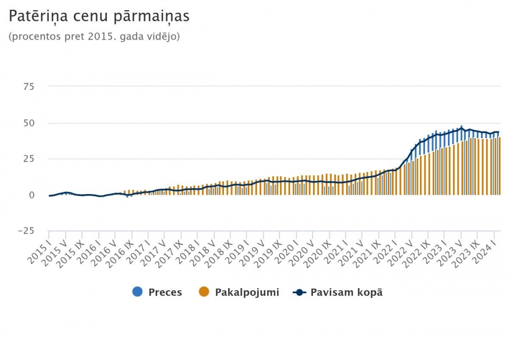 Salīdzinot ar 2015. gadu, patēriņa cenas 2024. gada februārī bija par 43,4 % augstākas. Precēm cenas pieauga par 43,7 %, bet pakalpojumiem – par 40,5 %.