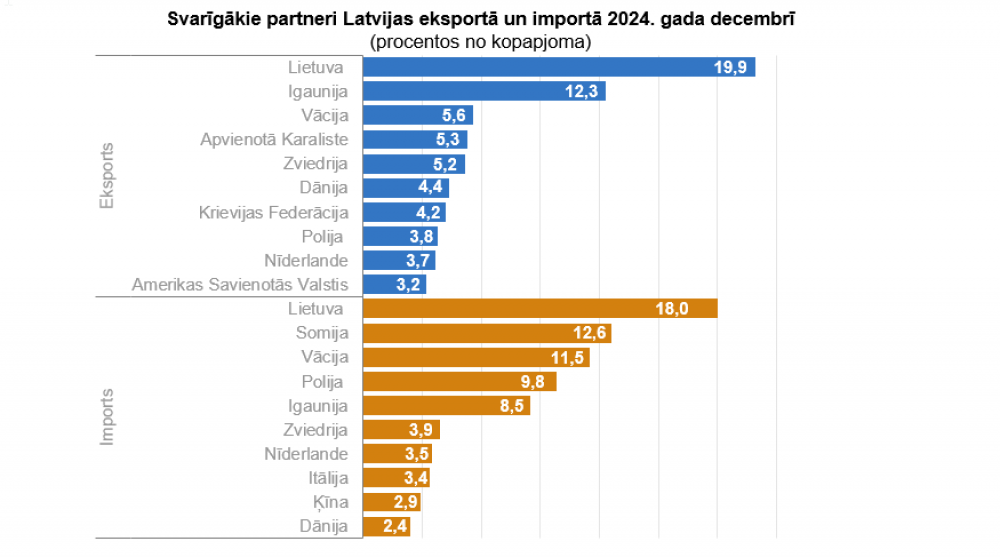 Decembrī svarīgākie eksporta partneri bija Lietuva (19,9% no eksporta kopapjoma), Igaunija (12,3%), Vācija (5,6%) un Apvienotā Karaliste (5,3%). Nozīmīgākie importa partneri – Lietuva (18% no importa kopapjoma), Somija (12,6%), Vācija (11,5%) un Polija (9,8%).