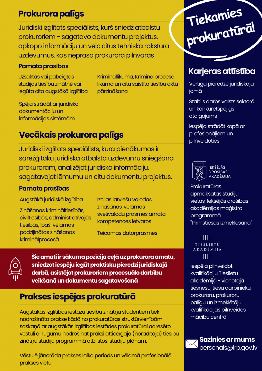2025. gada 24. septembrī tika aizvadīta “Prokuratūras studentu diena”, kurā topošajiem juristiem bija iespēja vairāk uzzināt par karjeras ceļu no studenta līdz prokuroram, gūt ieskatu prokurora palīga un vecākā prokurora palīga amata pienākumos un diskutēt ar prokuroriem par profesijas izaicinājumiem. Pasākuma mērķis bija iepazīstināt tiesību zinātņu studentus ar prokurora profesijas specifiku un ieinteresēt jaunos profesionāļus saistīt savu karjeru ar darbu prokuratūrā. Tas ir īpaši svarīgi prokuratūras darbības ilgtspējai, ņemot vērā, ka vairāk nekā trešdaļas prokuroru darba stāžs ir 20 un vairāk gadu. “Prokuratūras studentu diena” tika rīkota sadarbībā ar Latvijas Universitāti, Rīgas Stradiņa universitāti un Biznesa augstskolu “Turība”.