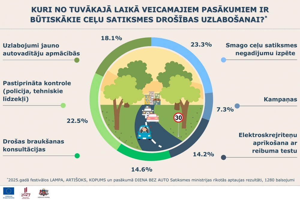 “Esam gandarīti par iedzīvotāju iesaisti, paužot savu viedokli par tuvākajā laikā veicamajiem pasākumiem ceļu satiksmes drošības uzlabošanā, jo drošs ceļš un katra satiksmes dalībnieka līdzatbildība ir mūsu kopīga rūpe, gan satiksmes nozares ekspertiem un politikas veidotājiem, gan iedzīvotājiem. Aptauja apliecina, ka sabiedrībai, tikpat svarīgi kā satiksmes nozares darbiniekiem, ir būtiski satiksmes drošības jautājumi”, uzsver Satiksmes ministrijas Autoceļu infrastruktūras departamenta direktors Tālivaldis Vectirāns.