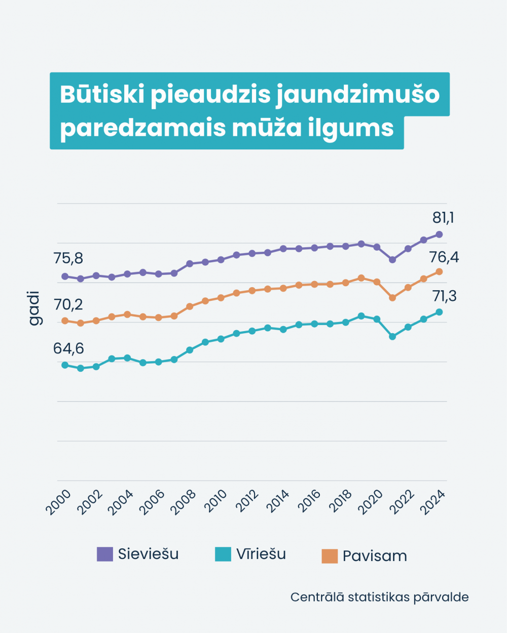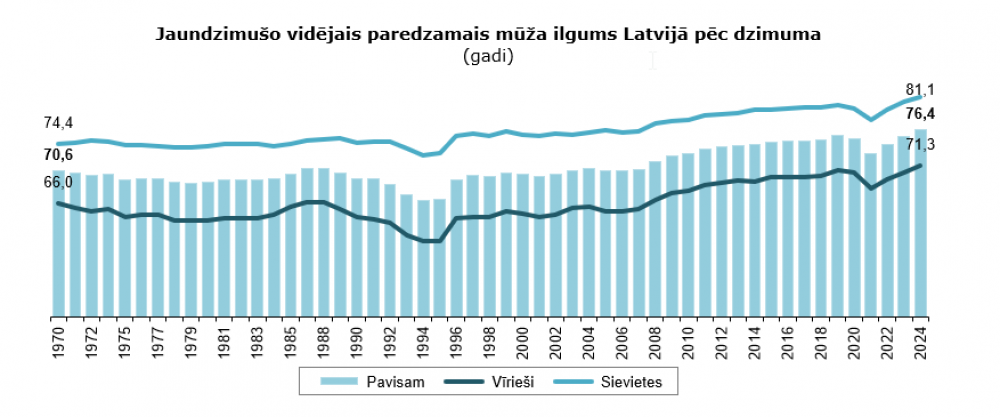 Demogrāfisko situāciju raksturojošs rezultatīvs rādītājs ir jaundzimušo vidējais paredzamais mūža ilgums*. 2021. un 2022. gadā Covid-19 pandēmijas dēļ bija vērojams neliels paredzamā mūža ilguma samazinājums. 2023. gadā mūža ilgums pieauga – no 74,4 līdz 75,5 gadiem (vīriešiem – no 69,4 līdz 70,4, sievietēm – no 79,3 līdz 80,4). Savukārt 2024. gadā dzimušo bērnu vidējais paredzamais mūža ilgums bija 76,4 gadi, vīriešiem – 71,3 gadi, sievietēm – 81,1 gads, kas ir augstākais jebkad bijušais rādītājs.