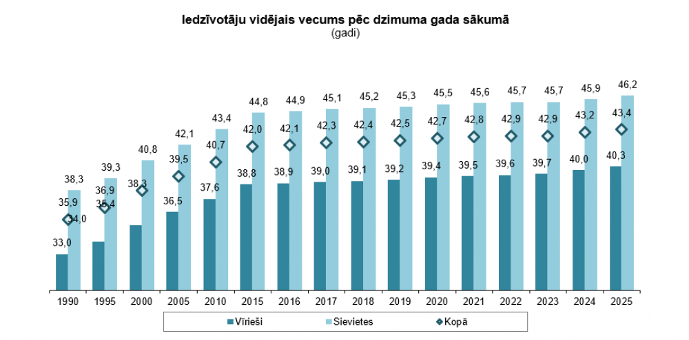 Iedzīvotāju vidējais vecums pakāpeniski pieaug un 2025. gada sākumā bija 43,4 gadi. Vīriešu vidējais vecums bija 40,3 gadi un sieviešu – 46,2 gadi. Rīgas reģionā iedzīvotāji ir jaunāki (vidējais vecums 42,6 gadi), Latgalē – vecāki (45,9 gadi).
