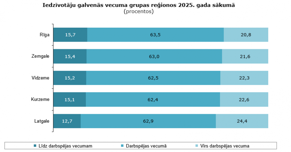 Salīdzinot reģionus un valstspilsētas, darbspējas vecuma (15–64 gadi) iedzīvotāju īpatsvars būtiski neatšķiras. Atšķirīgs ir līdz darbspējas (0–14 gadi) un virs darbspējas (65 un vairāk gadi) vecuma iedzīvotāju īpatsvars. 2025. gada sākumā visvairāk virs darbspējas vecuma iedzīvotāju bija Latgalē (gandrīz ceturtā daļa jeb 24,4% no visiem šī reģiona iedzīvotājiem). 2025. gada sākumā visvairāk darbspējas vecuma iedzīvotāju bija Rīgas reģionā (63,5%), pārējos reģionos tas svārstījās no 63,0% Zemgalē līdz 62,4% Kurzemē.