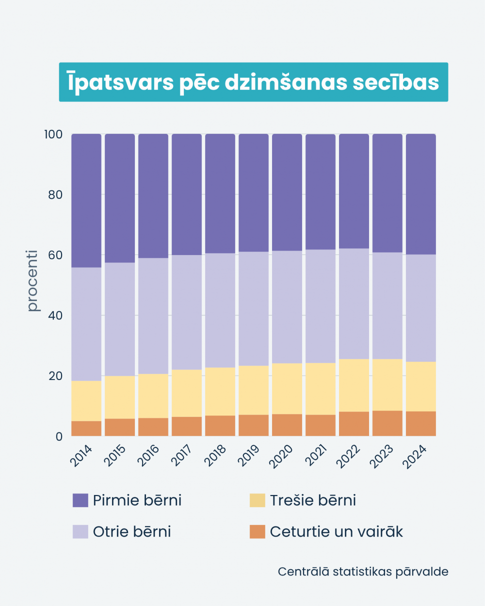 No visiem jaundzimušajiem pērn 39,9% bija pirmdzimtie (salīdzinājumam 2014. gadā – 44,2%), 35,5% otrie bērni (2014. gadā – 37,5%), 16,4% trešie (2014. gadā – 13,3%), savukārt 8,2% – ceturtie un vairāk (attiecīgi, 2014. gadā – 5,0%).