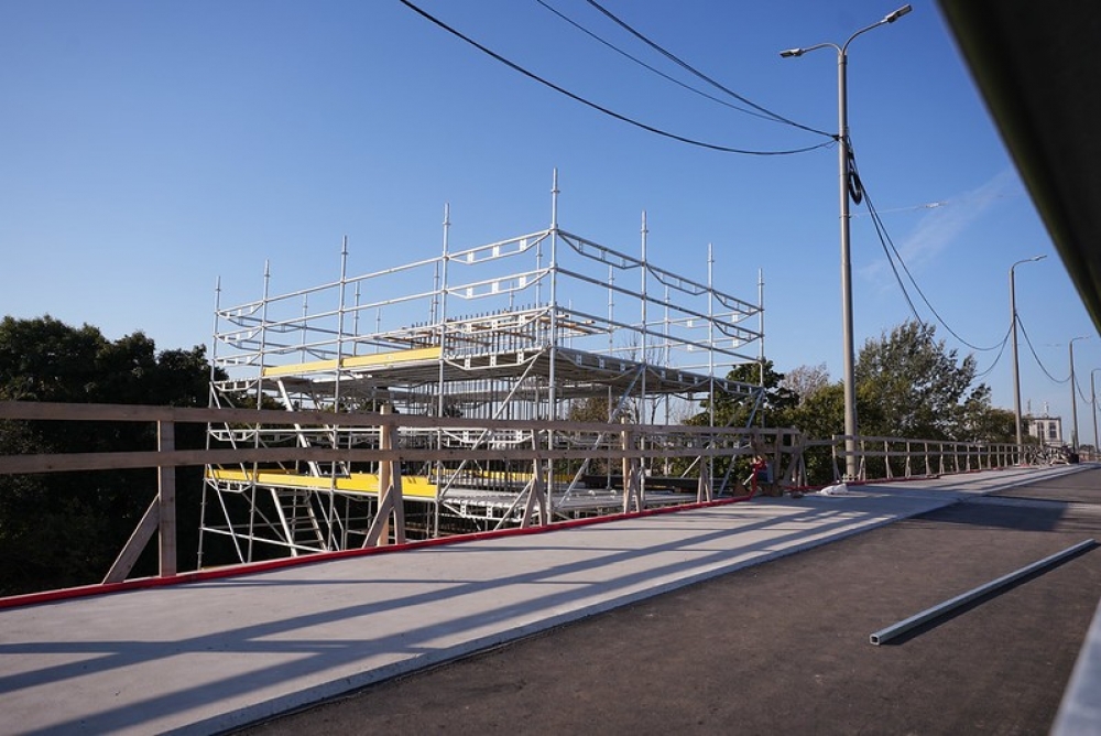 Tilta pārbūves darbi ir sadalīti trīs etapos un šobrīd ir pabeigts darbu otrais etaps, kas sevī ietver braucamās daļas konstrukcijas atjaunošanu un platākas ietves un veloceļa zonas izbūvi. Šobrīd turpinās drošības barjeru uzstādīšana atjaunotajā tilta daļā, kā arī tuvējās teritorijas labiekārtošanas darbi. Trešā etapa darbi ietver demontāžas darbus un stiegrojuma izbūvi uz pārvada, rīģeļu remontdarbus un laiduma remontdarbus no tilta apakšas.