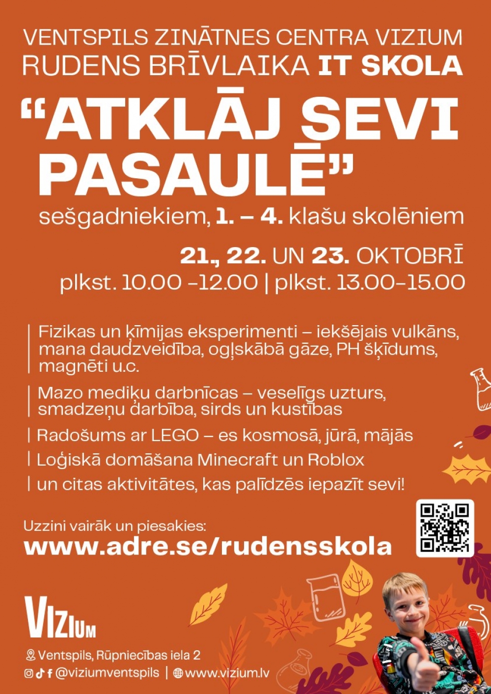 Rudens brīvlaika IT skoliņa norisināsies 21., 22. un 23. oktobrī Ventspils zinātnes centra VIZIUM mācību klasēs. Pieteikties iespējams, aizpildot anketu šeit.