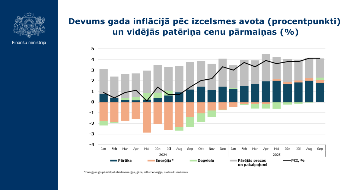 Kopumā cenu kāpums attīstās atbilstoši Finanšu ministrijas šā gada jūnijā izstrādātajām makroekonomikas prognozēm. Sagaidāms, ka gada inflācija šā gada oktobrī būs nedaudz zem, bet tuvu 4%. Savukārt patēriņa cenu pieaugums novembrī un decembrī piebremzēsies attiecīgi līdz 3,7% un 3,5%. Šādu patēriņa cenu kāpumu var raksturot kā augstu, it īpaši salīdzinājumā ar iepriekšējo gadu, ko lielā mērā nosaka tikai dažas preču un pakalpojumu grupas. Vienlaikus, analizējot patēriņa cenu pārmaiņas, svarīgi pieminēt arī darba samaksas izmaiņas, jo šīs divas komponentes vienlaicīgi ietekmē mājsaimniecību patēriņu. Darba samaksas pieaugums šogad vairāk nekā divas reizes pārsniedz inflāciju. Lai arī dati par trešo ceturksni vēl nav pieejami, dati par pirmo pusgadu liecina, ka vidējā darba samaksa palielinājusies par 8,2%. Tomēr tas nav veicinājis privāto patēriņu, kas šā gada pirmajā pusē samazinājies par 0,4%. Viens no iemesliem tam ir straujais pārtikas cenu lēciens. Pārtikas preces ir pieskaitāmas pie cenu neelastīgām precēm, jo tās grūti aizstāt ar citām precēm, līdz ar to grūti minimizēt cenu ietekmi uz mājsaimniecību izdevumiem.