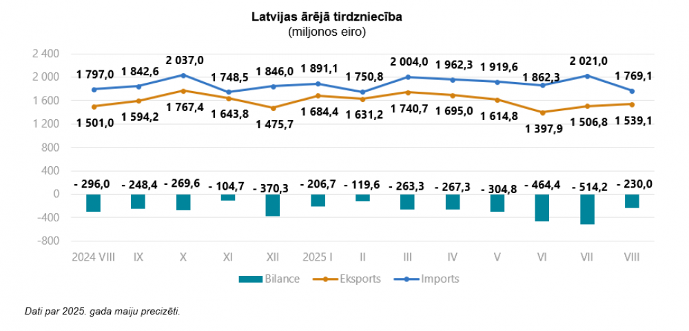Šā gada astoņos mēnešos Latvijas ārējās tirdzniecības apgrozījums faktiskajās cenās sasniedza 27,99 miljardus eiro – par 1 412,7 milj. eiro jeb 5,3% vairāk nekā 2024. gada atbilstošajā periodā. Eksporta vērtība veidoja 12,81 miljardu eiro (pieaugums par 451,5 milj. eiro jeb 3,7%), bet importa – 15,18 miljardus eiro (pieaugums par 961,2 milj. eiro jeb 6,8%).