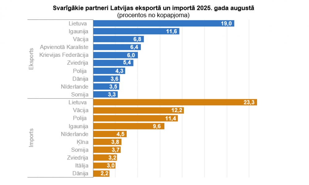 Augustā svarīgākie eksporta partneri bija: Lietuva (19% no eksporta kopapjoma), Igaunija (11,6%), Vācija (6,8%) un Apvienotā Karaliste (6,4%). Nozīmīgākie importa partneri – Lietuva (23,3% no importa kopapjoma), Vācija (12,2%), Polija (11,4%) un Igaunija (9,6%).