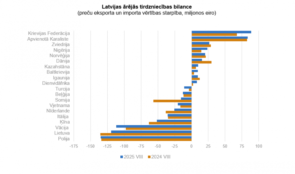 2025. gada augustā Latvijas ārējās tirdzniecības bilance bija pozitīva ar 113 partnervalstīm, preču eksporta vērtībai pārsniedzot importa vērtību. Negatīva tā bija tirdzniecībā ar 51 valsti.