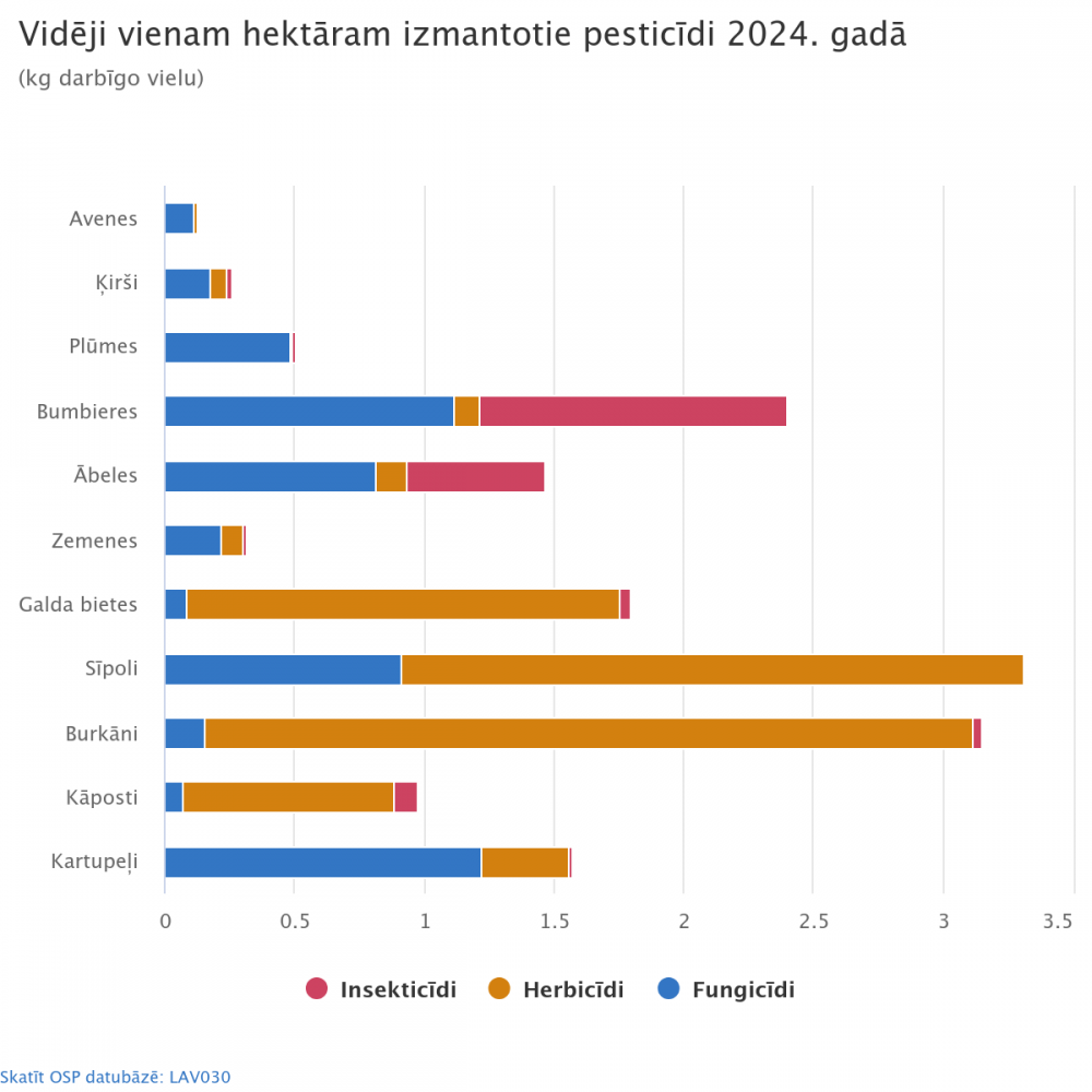 Herbicīdu lietošana pieaugusi kāpostu stādījumu hektāram – no 0,64 kg 2019. gadā līdz 0,81 kg 2024. gadā jeb par 26 %, sīpolu platībās – no 1,96 kg līdz 2,40 kg jeb par 43 % un zemeņu platībās – no 0,06 kg līdz 0,09 kg jeb par 58 %, savukārt biešu platībās herbicīdu patēriņš uz hektāru nedaudz samazinājās – attiecīgi no 1,69 kg līdz 1,68 kg jeb par 1 %.