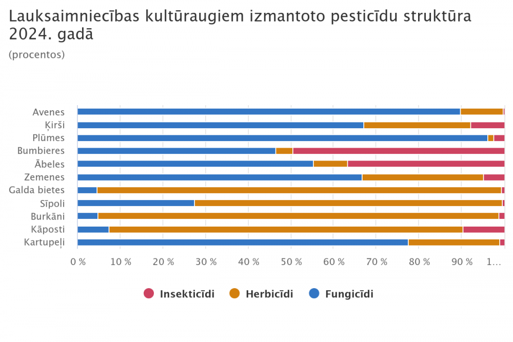 Dārzeņu platībās insekticīdi pērn tika izmantoti ļoti nelielā apjomā – tikai 10 % no kāpostu stādījumos izmantotajiem pesticīdiem bija insekticīdi, bet burkānu, biešu, sīpolu, zemeņu, arī kartupeļu stādījumos mazāk nekā 1 % no izmantotajiem pesticīdiem bija insekticīdi.