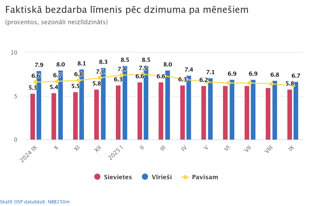 Sieviešu bezdarba līmenis septembrī samazinājies par 0,2 procentpunktiem līdz 5,8 %, bet vīriešu – par 0,1 procentpunktu līdz 6,7 %.