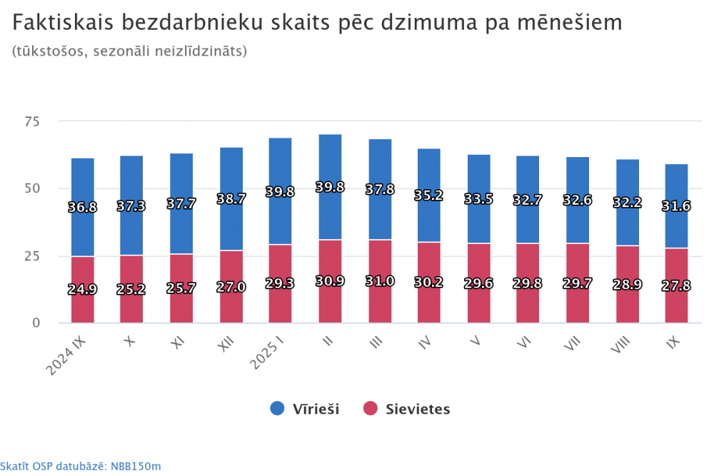 Septembrī Latvijā bija 59,3 tūkstoši bezdarbnieku, kas ir par 1,8 tūkstošiem mazāk nekā augustā un par 2,4 tūkstošiem mazāk nekā 2024. gada septembrī. Mēneša laikā vīriešu bezdarbnieku skaits samazinājās par 0,6 tūkstošiem līdz 31,6 tūkstošiem un bez darba esošo sieviešu skaits samazinājies par 1,2 tūkstošiem līdz 27,8 tūkstošiem.