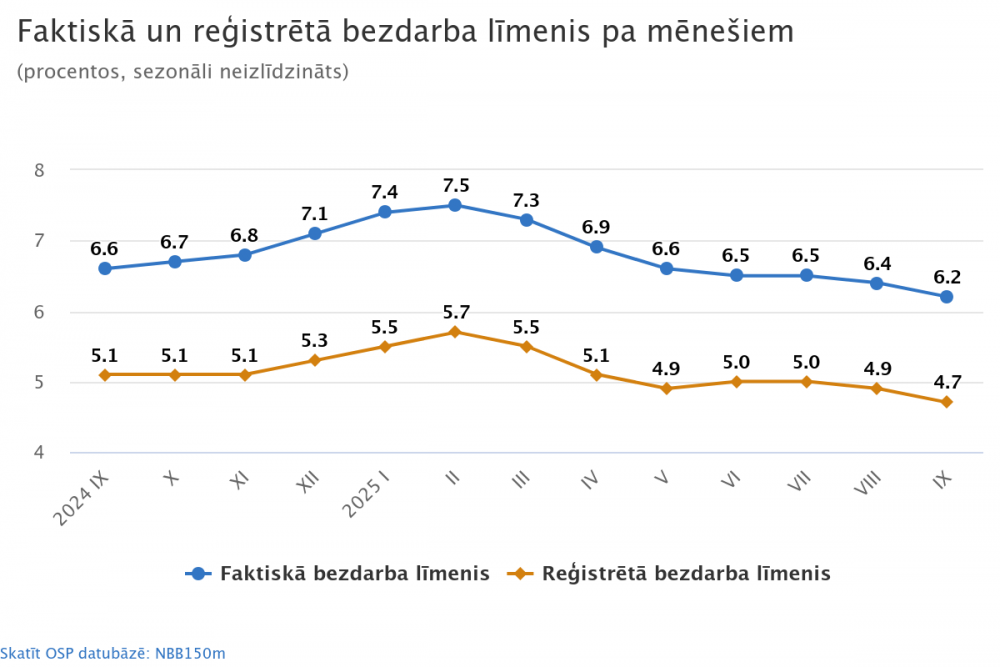 Nodarbinātības valsts aģentūrā (NVA) reģistrētā bezdarba līmenis bija 4,7 %, un kopš augusta tas ir samazinājies par 0,2 procentpunktiem, bet, salīdzinot ar 2024. gada septembri, reģistrētā bezdarba līmenis ir samazinājies par 0,4 procentpunktiem.