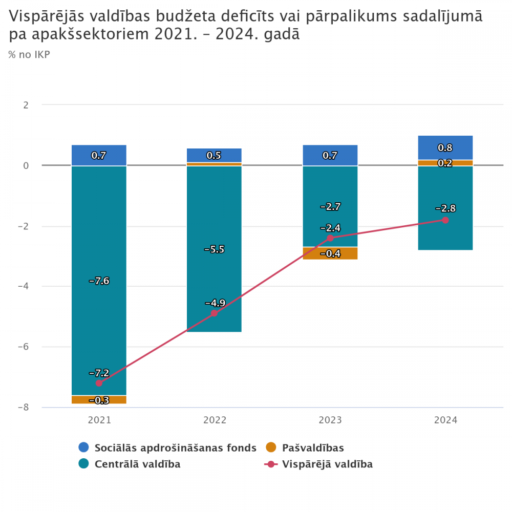 Vispārējās valdības budžeta deficīts procentos pret IKP | 7,2 | 4,9 | 2,4 | 1,8 |