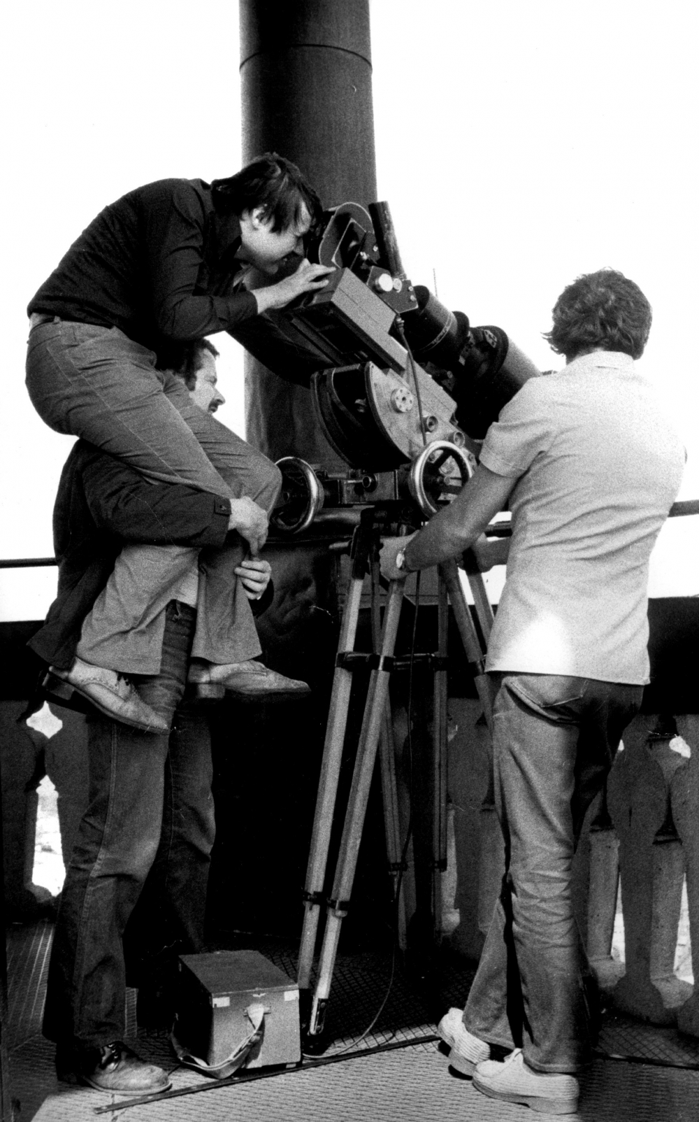 Romualds Pipars filmē uz pleciem Jānim Milbretam.