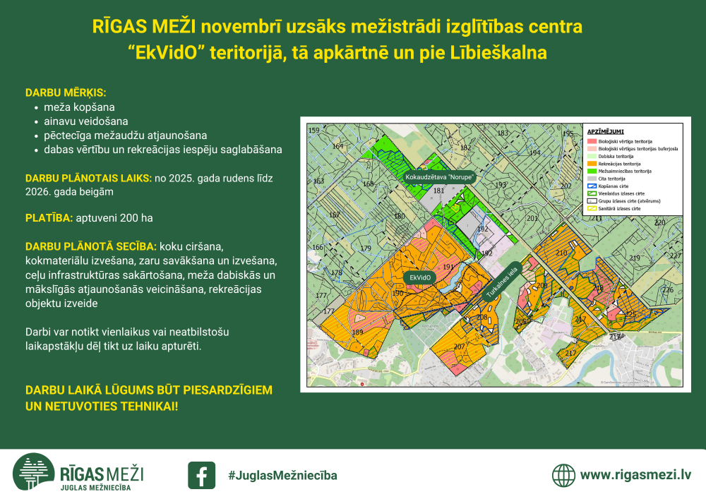 2025. gada novembrī SIA “Rīgas meži” uzsāks mežizstrādi vides izglītības centra “EkVidO” teritorijā, tā apkārtnē un pie Lībieškalna.