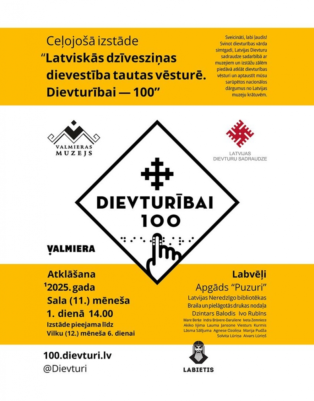 Latvijas Dievturu sadraudze sadarbībā ar muzejiem un izstāžu zālēm piedāvā ceļojošo izstādi “Latviskās dzīvesziņas dievestība tautas vēsturē. Dievturībai – 100”, kas atklāj dievturības vēsturi un ļauj apskatīt sadraudzes sarūpētos nacionālos dārgumus no Latvijas muzeju krātuvēm. Izstādi Valmieras muzeja Izstāžu namā atklās Sala (11.) mēneša 1. dienā plkst. 14.00. Plašāk šeit: https://www.valmierasnovads.lv/valmieras-muzeja-bus-skatama-dievturibas-varda-simtgadei-veltita-izstade/.