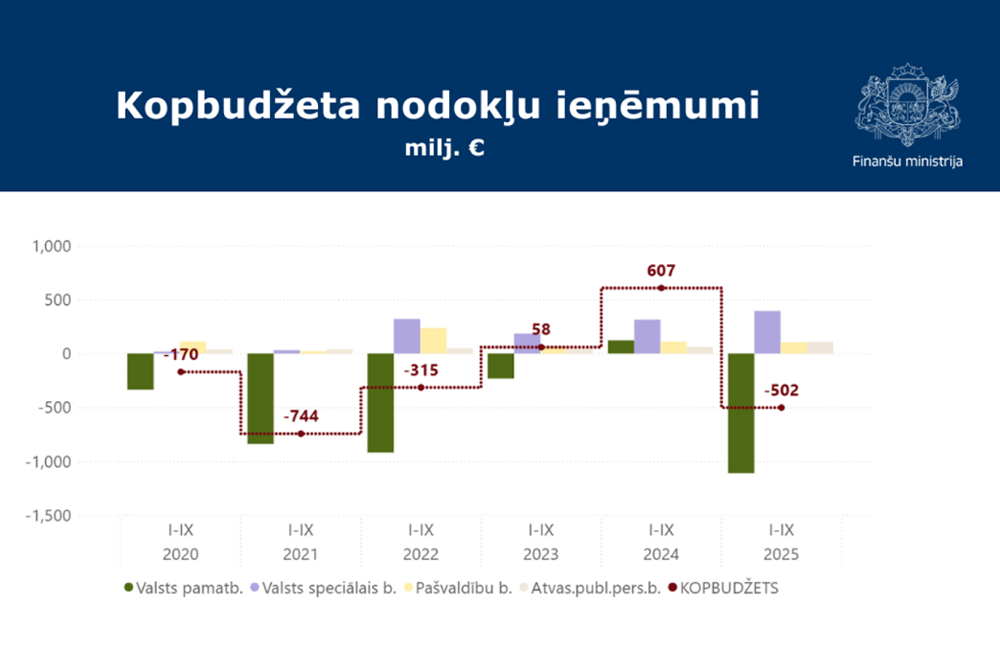 Kopbudžeta nodokļu ieņēmumi (ieskaitot atlikumu vienotajā nodokļu kontā) šā gada deviņos mēnešos iekasēti par 579,2 miljoniem eiro jeb 5,8% vairāk salīdzinājumā ar 2024. gada attiecīgo periodu, veidojot 10,6 miljardus eiro apmērā. Kopbudžeta nodokļu ieņēmumi (neieskaitot atlikumu vienotajā nodokļu kontā) 2025. gada trīs ceturkšņos veidoja 99,1% no periodā plānotā apmēra.