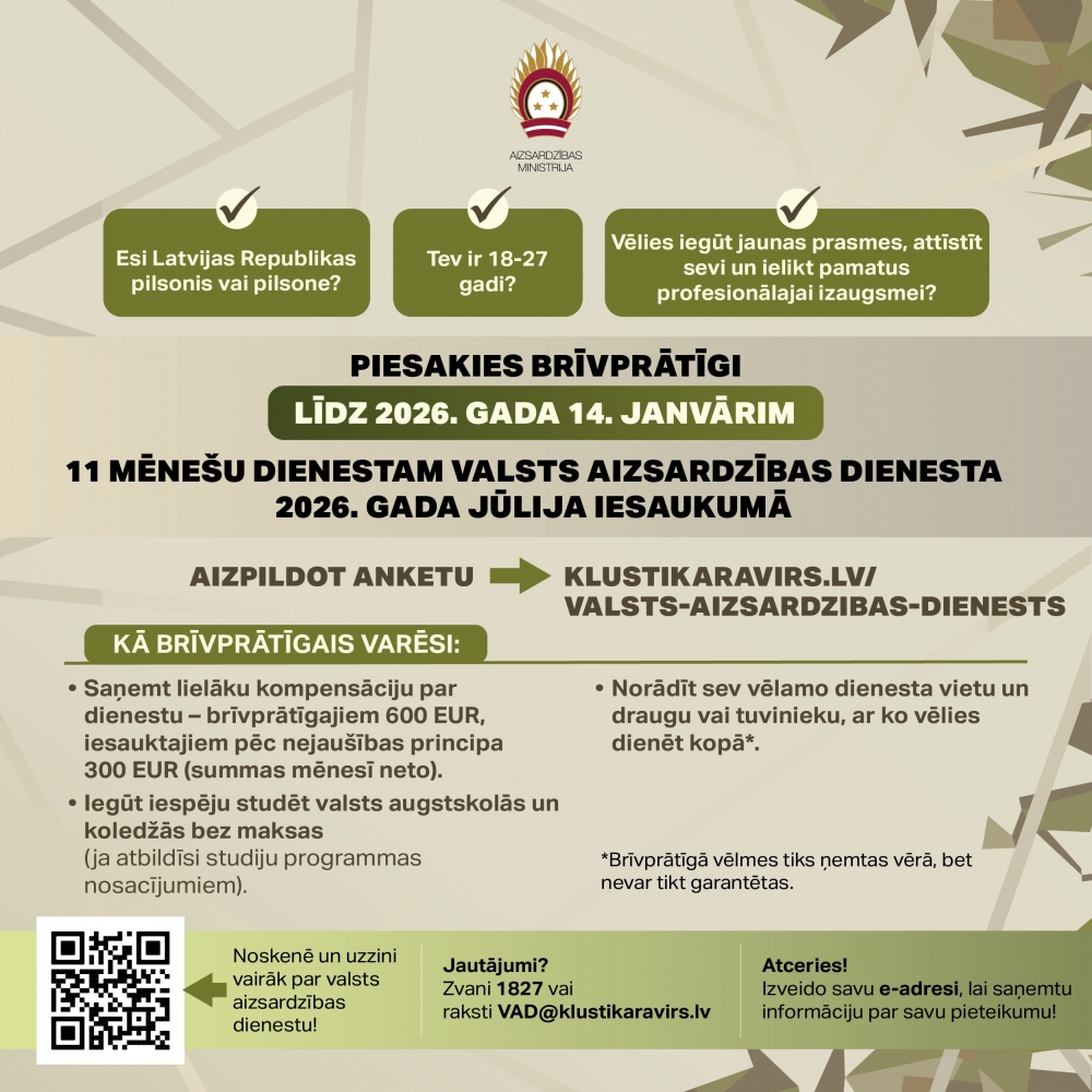2026. gada jūlija iesaukumā 11 mēnešu militārajam dienestam nepieciešami 1470 jaunieši, kuri dienesta pienākumus pildīs Nacionālo bruņoto spēku vienībās. Savukārt 2026. gadā piecu gadu dienestam Zemessardzē brīvprātīgi var pieteikties līdz 700 jauniešiem.