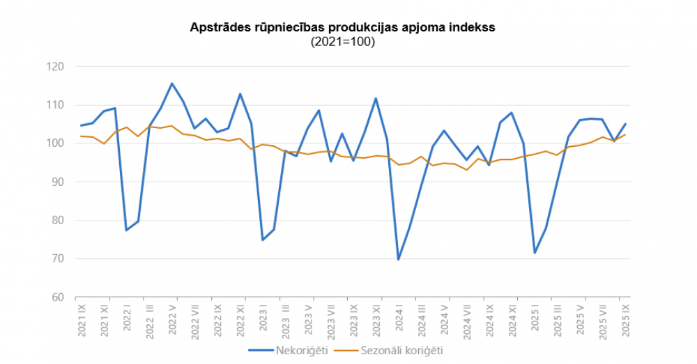 2025. gada septembrī, salīdzinot ar 2024. gada septembri, apstrādes rūpniecības apgrozījums pēc kalendāri koriģētiem datiem faktiskajās cenās palielinājās par 11,0%. Apgrozījums vietējā tirgū palielinājās par 7,5%, bet eksportā par 12,9% (tai skaitā eirozonā par 11,4%, bet ārpus eirozonas par 14,4%).