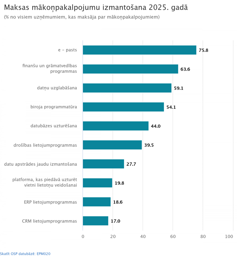 2025. gadā mākoņpakalpojumus izmanto vairāk nekā puse jeb 51,9 % uzņēmumu, savukārt maksas mākoņpakalpojumus – 44,1 % no visiem uzņēmumiem, un tas ir par 8,3 procentpunktiem vairāk nekā 2023. gadā. Lielo uzņēmumu grupā maksas mākoņpakalpojumus izmanto 83,4 % (pieaugums par 3,7 procentpunktiem), vidējo uzņēmumu grupā 59,2 % (pieaugums par 7,5 procentpunktiem), savukārt mazo uzņēmumu grupā 40,1 % (pieaugums par 8,2 procentpunktiem) [2].