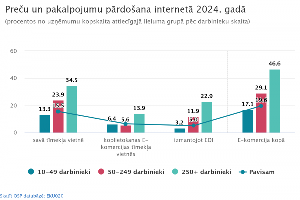 Viens no e-komercijas [3] attīstību raksturojošiem rādītājiem ir uzņēmumu īpatsvars, kas preces vai pakalpojumus pārdod internetā, izmantojot tīmekļvietnes vai lietotnes, vai elektronisko datu apmaiņas sistēmu (EDI [4]). 2024. gadā tirdzniecību internetā īstenoja 19,6 % uzņēmumu. Salīdzinot ar 2023. gadu, šis rādītājs nav būtiski mainījies. Lielo uzņēmumu grupā vērojams pieaugums par 3,0 procentpunktiem, un pārdošanu internetā nodrošināja 46,6 % uzņēmumu. Mazo uzņēmumu grupā rādītājs saglabājies nemainīgs (17,1 %), savukārt vidējo uzņēmumu grupā preču un pakalpojumu pārdošana internetā pieauga par 0,7 procentpunktiem, sasniedzot 29,1 %.
