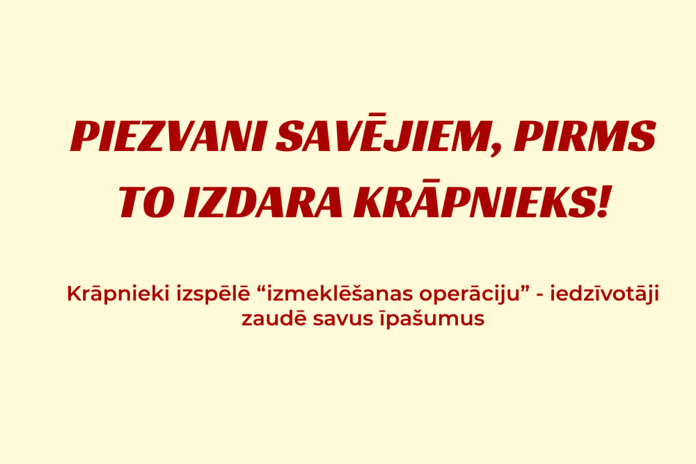 Šī gada otrajā pusē Valsts policijā saņemta informācija par vairākiem gadījumiem dažādās Latvijas pilsētās, kad iedzīvotāji krāpniecisku darbību rezultātā zaudējuši savus nekustamos īpašumus. Viss sākas ar it kā policista, kurš patiesībā ir krāpnieks, zvanu. Viltvārdis apgalvo, ka šobrīd kāds mēģina pārdot konkrētās personas dzīvokli. Tālāk persona tiek pārliecināta, ka, lai nezaudētu īpašumu, jāiesaistās “operācijā”, lai palīdzētu noķert vainīgo. Uzticoties šim stāstam, cilvēks piekrīt pārdot dzīvokli kā daļu no izdomātās operācijas.