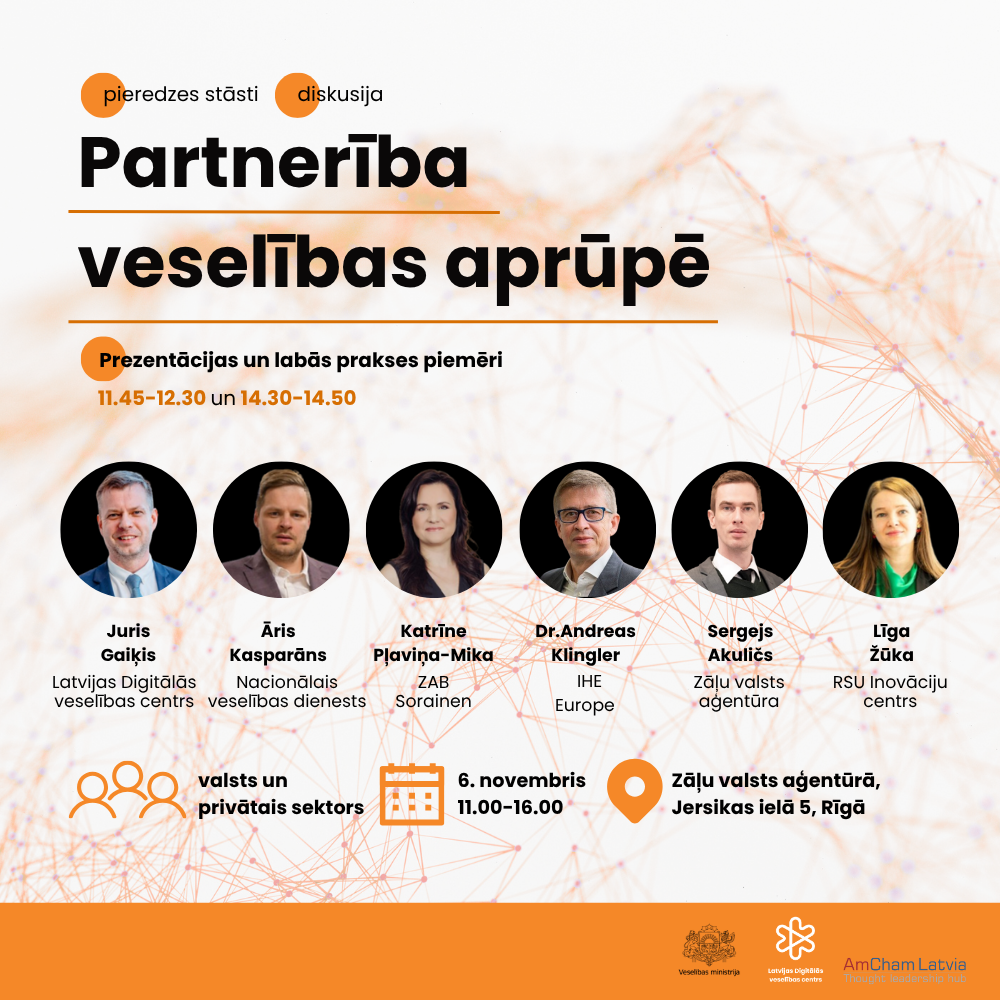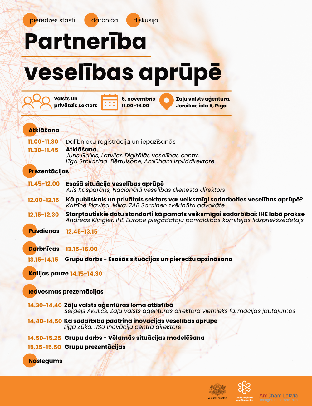 Pasākuma pirmajā daļā Nacionālā veselības dienesta direktors Āris Kasparāns klātesošos iepazīstinās ar esošo situācija veselības aprūpē. Juridisko pamatu ilgtspējīgai partnerībai veselības aprūpē prezentēs zvērinātu advokātu biroja “Sorainen” zvērināta advokāte Katrīne Pļaviņa-Mika. Savukārt par starptautiskiem datu standartiem, kas kalpo kā pamats veiksmīgai sadarbībai, stāstīs IHE Europe piegādātāju pārvaldības komitejas līdzpriekšsēdētājs Andreas Klinglers.