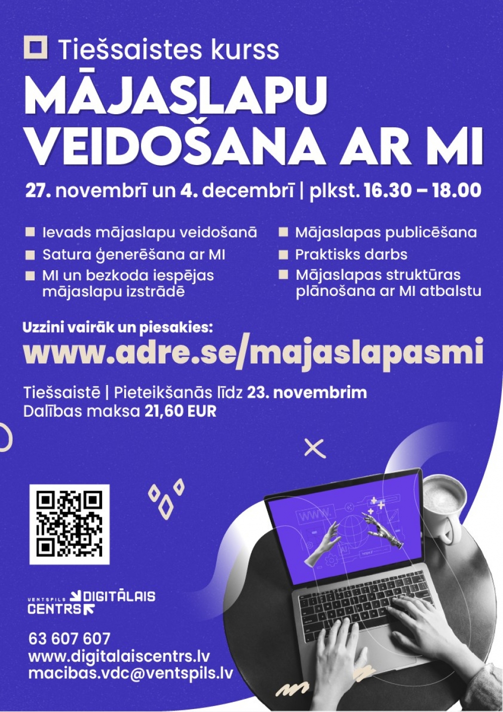 Papildu informācija Ventspils Digitālajā centrā, Akmeņu ielā 3, rakstot uz e-pasta adresi macibas.vdc@ventspils.lv vai zvanot pa tālruni 63607607. Aktuālā informācija par Digitālā centra piedāvājumu pieejama sociālajos medijos Facebook un Instagram @vdcentrs, kā arī tīmekļvietnē www.digitalaiscentrs.lv.