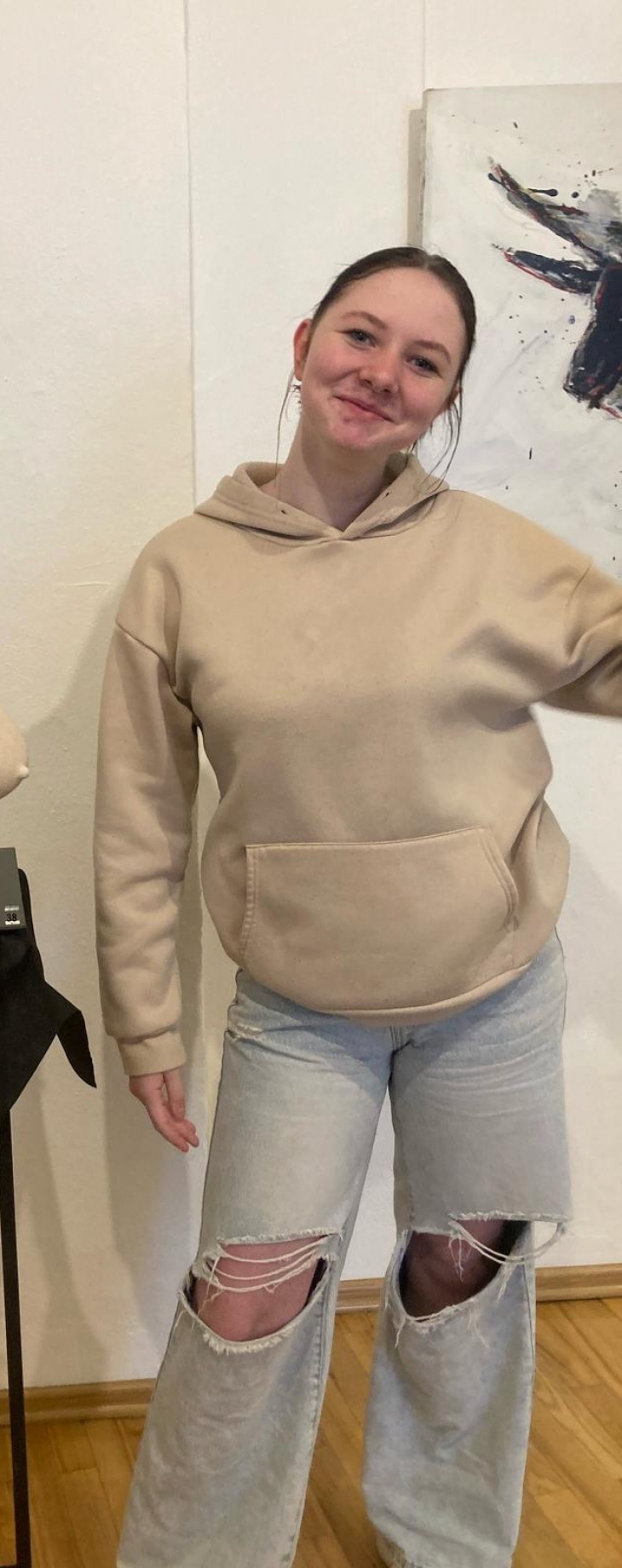 Ģērbusies brūnas krāsas jakā ar kapuci, brūnas krāsas vestē, melnas krāsas ādas imitācijas platās biksēs, baltas krāsas Nike sporta apavos.