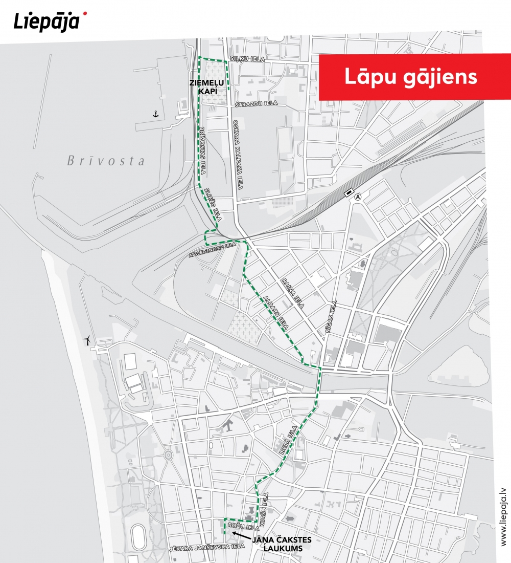 Lāpu gājiens sāksies pulksten 19.00, virzoties pa pilsētas centra ielām – no Jāņa Čakstes laukuma, pāri Tramvaja tiltam, tālāk nogriežoties uz Kaiju ielu un turpinoties pa Aldaru un Kapsētas ielu. Sakarā ar Kalpaka ielas remontdarbiem, gājiens šogad tiks novirzīts pa Atslēdznieku ielu, caur ostas teritoriju, un tālāk pa Siļķu ielu, nogriežoties uz Kalpaka ielu un noslēdzoties pie Ziemeļu kapiem. Aicinām ņemt vērā, ka šī gada lāpu gājiena maršruts būs garāks un sarežģītāks nekā iepriekš, tāpēc aicinām izvērtēt savu dalību un ņemt vērā, ka atgriešanās pilsētas centrā var būt apgrūtināta.