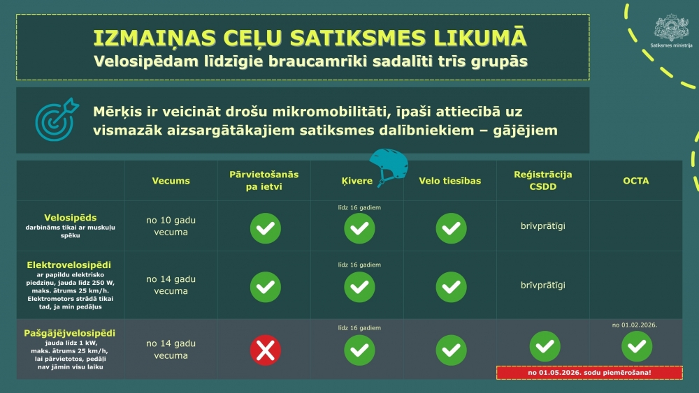 Tāpat SM ir izstrādājusi un nodevusi saskaņošanā iesaistītajām ministrijām arī grozījumus Ceļu satiksmes noteikumos (CSN) par obligātu OCTA dažādiem citiem braucamrīkiem – sporta atpūtas inventāram, piemēram, monoriteņiem, skrituļdēļiem u. c. mikromobilitātes rīkiem. Grozījumi CSN paredzēti arī pašgājējvelosipēdu iekļaušanai kopējā ceļu satiksmē.