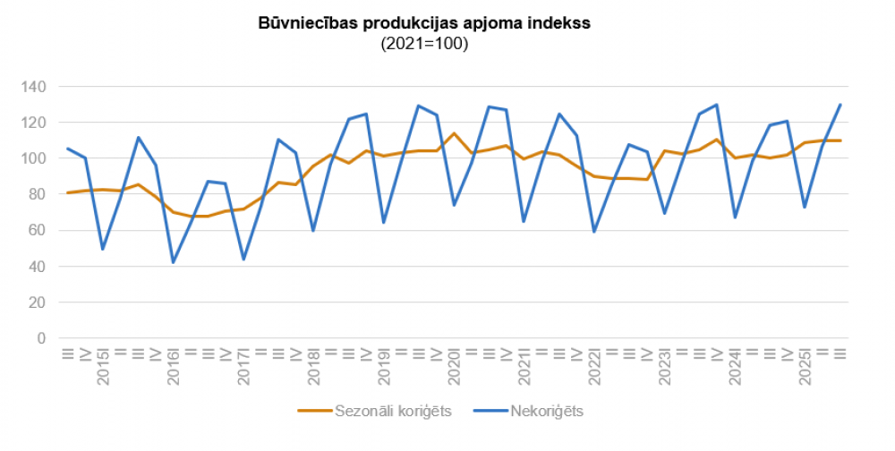 2025. gada 3. ceturksnī, salīdzinot ar 2025. gada 2. ceturksni, būvniecības produkcijas apjoms pēc sezonāli koriģētiem datiem salīdzināmajās cenās samazinājās par 0,2%. Specializētie būvdarbi samazinājās par 2,7%, bet ēku būvniecība un inženierbūvniecība palielinājās par 1,3% katra.