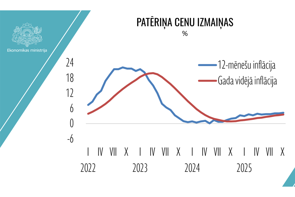 2025. gada oktobrī, salīdzinot ar iepriekšējā gada oktobri, patēriņa cenas pieauga par 4,3%. Gada vidējā inflācija bija 3,6%.