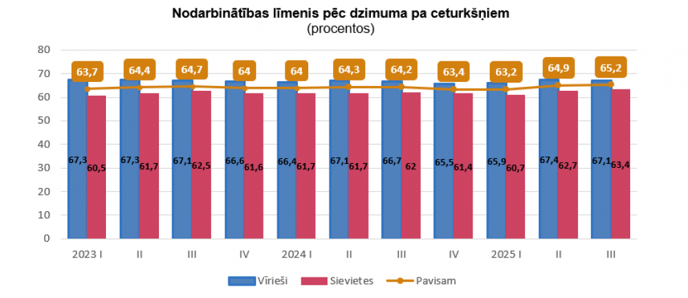 3. ceturksnī vīriešu nodarbinātības līmenis bija par 3,7 procentpunktiem augstāks nekā sieviešu (attiecīgi – 67,1% un 63,4%).