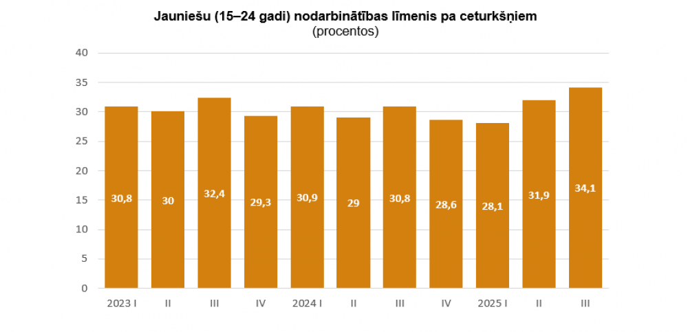 2025. gada 3. ceturksnī nodarbinātības līmenis jauniešiem 15–24 gadu vecumā bija 34,1%, kas ir par 3,3 procentpunktiem augstāks rādītājs nekā attiecīgajā periodā pērn. Nodarbināti bija 64,2 tūkstoši jauniešu (2024. gada 3. ceturksnī – 58,2 tūkstoši).