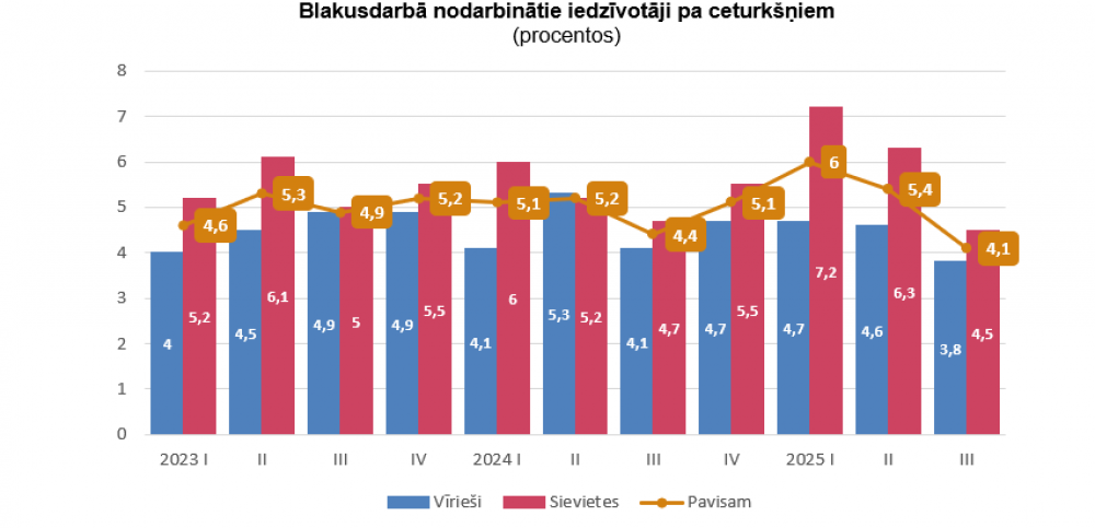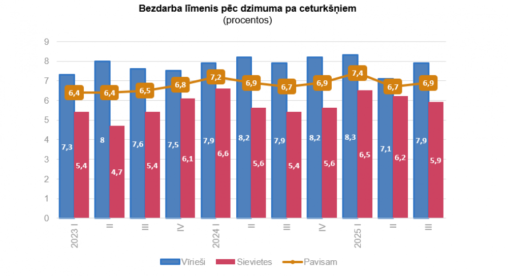 Šī gada 3. ceturksnī 66,2 tūkstoši iedzīvotāju vecumā no 15 līdz 74 gadiem bija bezdarbnieki. Salīdzinot ar 2024. gada 3. ceturksni, bezdarbnieku skaits ir palielinājies par 3,2 tūkstošiem jeb 5,1% un salīdzinot ar iepriekšējo ceturksni – par 2,5 tūkstošiem jeb 4,0%. Bezdarba līmenis Latvijā bija 6,9%, kas ir par 0,2 procentpunktiem augstāks nekā pirms gada un par 0,2 procentpunktiem augstāks nekā 2. ceturksnī.