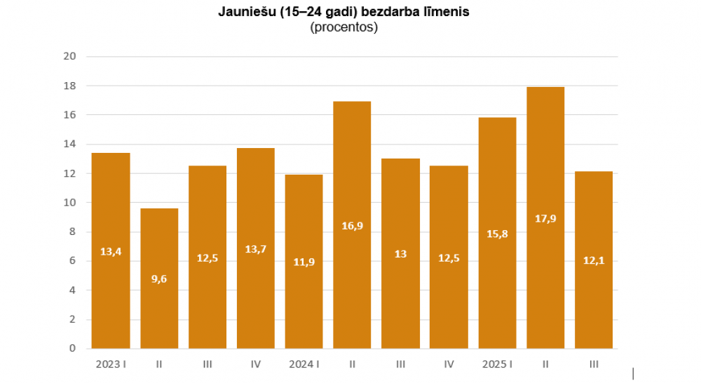 2025. gada 3. ceturksnī no visiem bezdarbniekiem 8,8 tūkstoši jeb 13,3% bija jaunieši 15–24 gadu vecumā. Gada laikā jauniešu bezdarbnieku skaits ir palielinājies par 0,2 tūkstošiem, bet, salīdzinot ar iepriekšējo ceturksni – samazinājies par 4,1 tūkstoti. Jauniešu īpatsvars gada laikā samazinājies par 0,4 procentpunktiem, savukārt, salīdzinot ar iepriekšējo ceturksni – par 7,0 procentpunktiem.